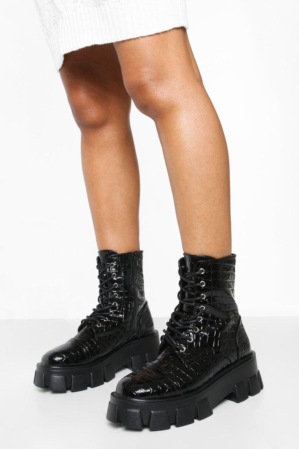 boohoo Chunky Cleated Patent Croc Combat Boots - Black - Size 5